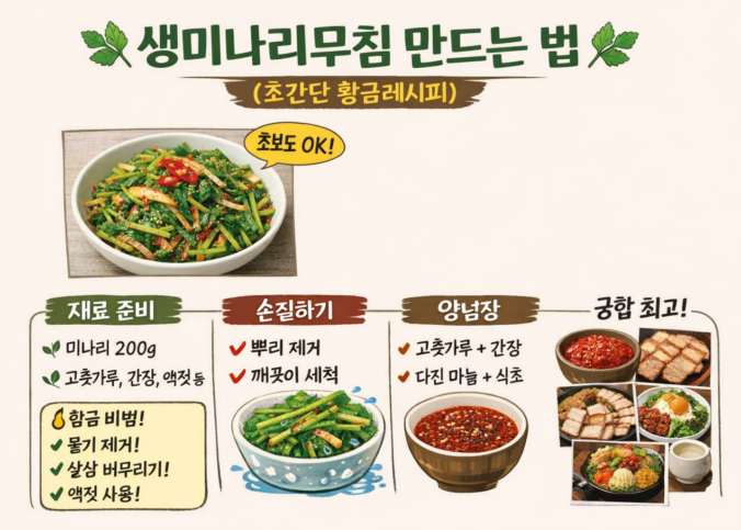 생미나리무침 만드는 법, 향긋하고 아삭하게 만드는 초간단 황금레시피 작성자 lcm1852 2026년 03월 24일2026년 03월 24일 별빛지기의 '생생 요리 레시피' 봄이 되면 유난히 생각나는 채소가 있습니다. 바로 미나리입니다. 특유의 향긋함과 아삭한 식감, 입안 가득 퍼지는 싱그러운 향 덕분에 많은 분들이 봄철 밥상에 꼭 올리는 나물 중 하나입니다. 특히 생미나리무침은 데치지 않고 바로 무쳐내기 때문에 미나리 본연의 향과 식감을 가장 잘 느낄 수…